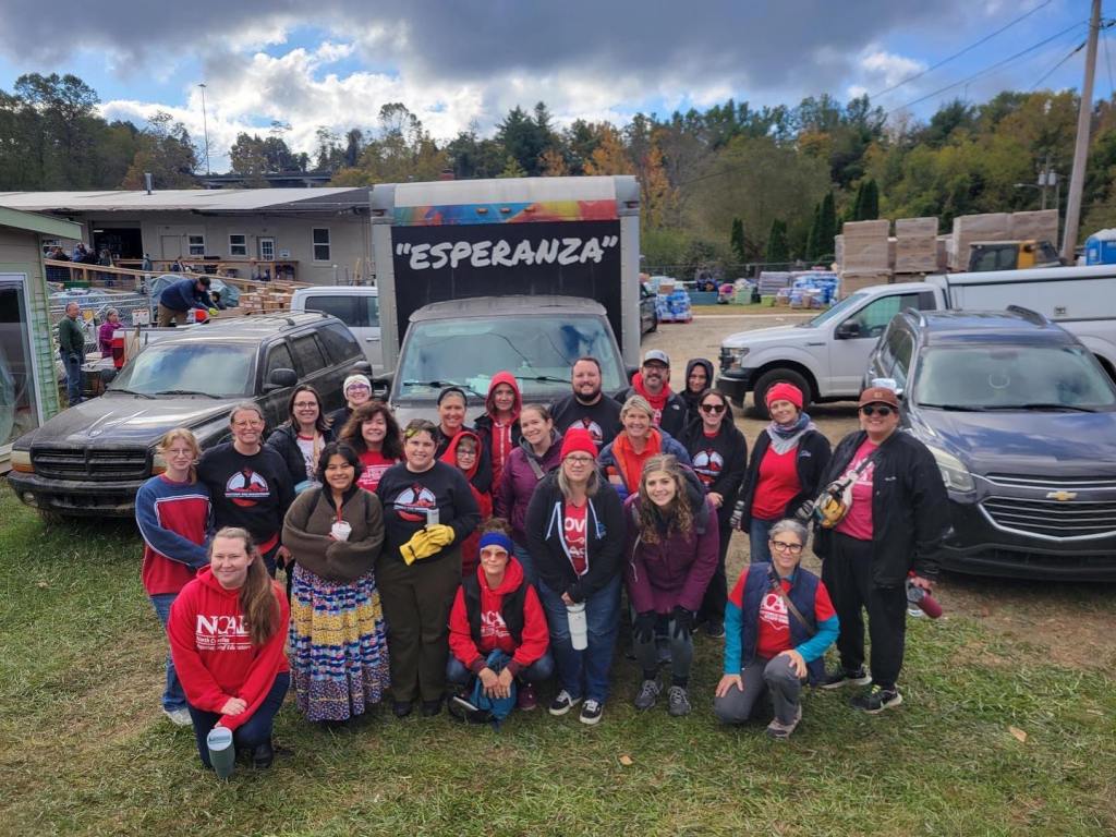 (A group of union members helping with aid efforts at BeLoved Asheville, October 16, 2024)