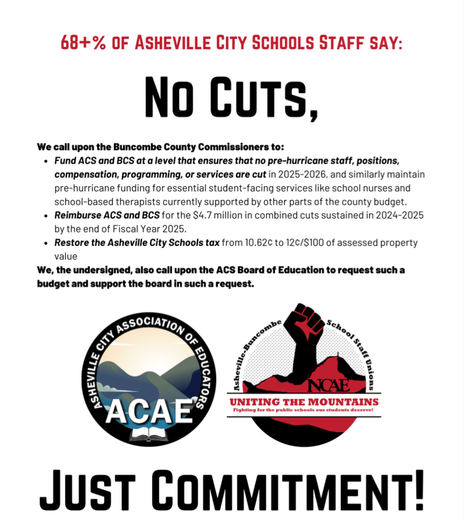 In January 2025, blaming the economic impacts from Helene, our county government cut mid-year local education funding by $4.7 million, affecting not only Asheville City Schools but also the neighboring Buncombe County Schools. Though this funding cut was absorbed by the reserve fund balance of ACS and BCS, the fear was that these cuts were not a one-off. Asheville City Association of Educators and Buncombe County Association of Educators both deeply opposed this mid-year cut.
